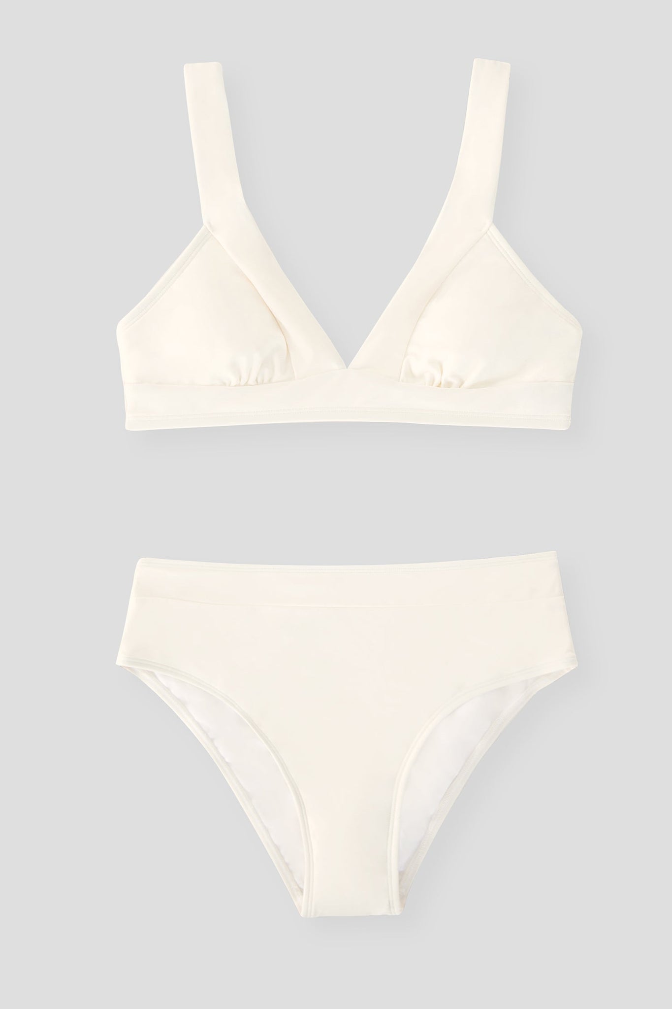 Faites ressortir votre bronzage dans ce bikini bralette ¨¤ col en V et bande large taille haute blanc comprenant une bralette avec un col en V, des bretelles et une fermeture en forme de crochet dans le dos, ainsi qu'une paire de bas assortis avec une taille haute ¨¤ bandes.