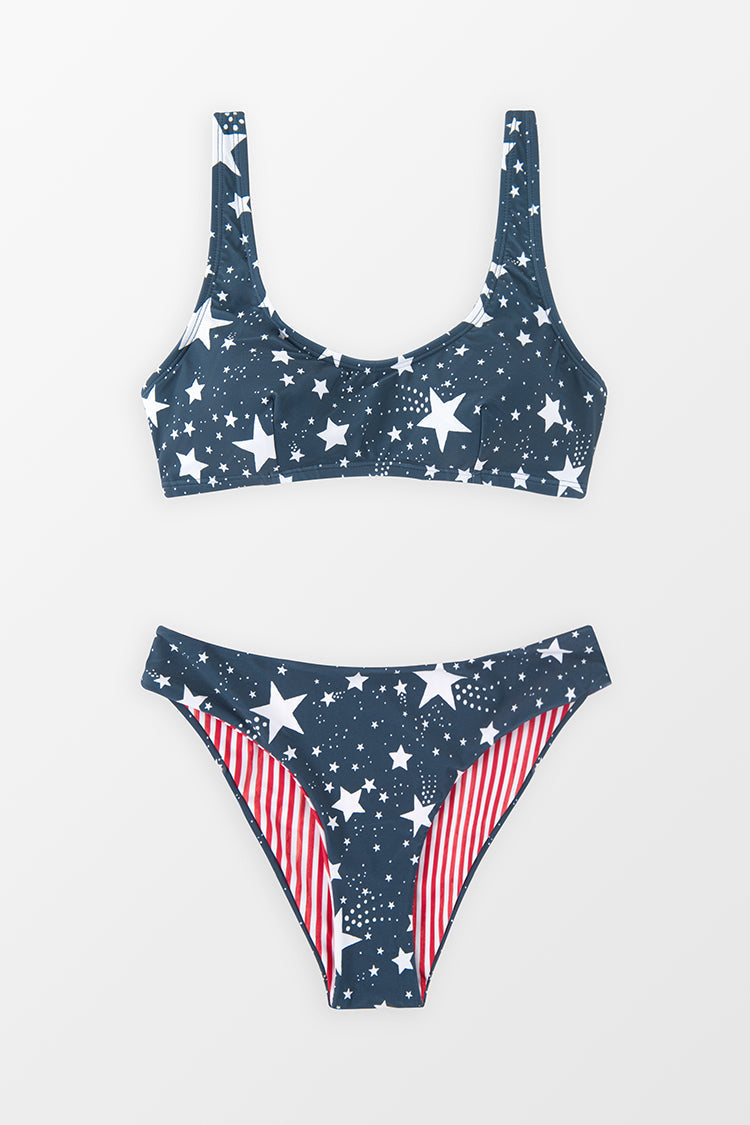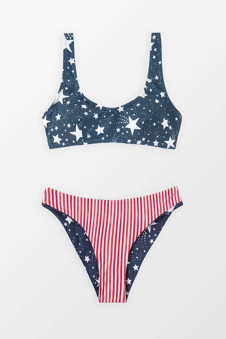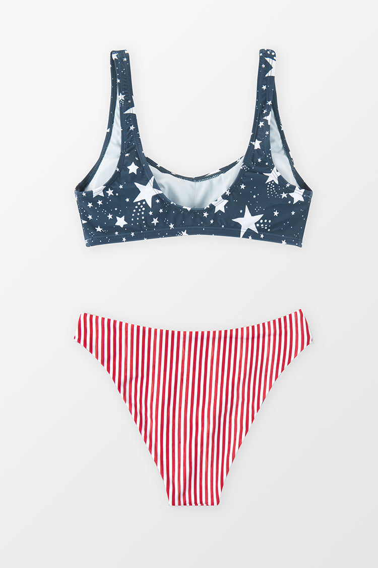 Nous ressentons totalement ce bikini bralette ¨¤ rayures ultra cheeky r¨¦versiblet patriotique pour la fille du 4 juillet?! Il pr¨¦sente mod¨¨le brassi¨¨re avec imprim¨¦ ¨¦toiles sur l'ensemble, col scoop et bretelles, ainsi qu'une paire de bas r¨¦versibles avec motif ¨¦toiles et rayures, couverture extra coquine des fesses et coupe ¨¦chancr¨¦e.