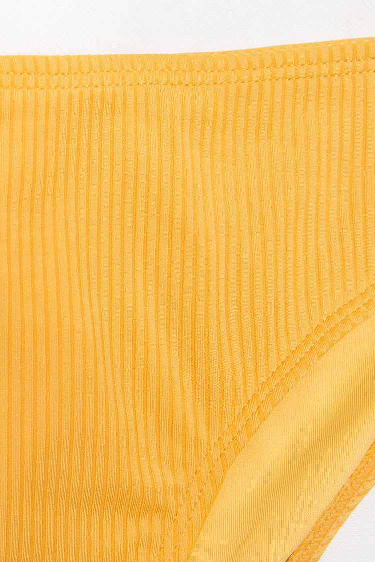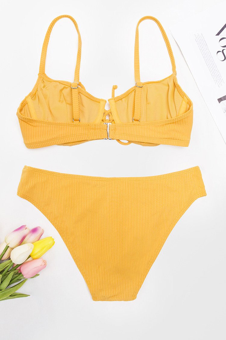 Pr¨¦parez-vous ¨¤ attraper les vagues dans notre bikini c?tel¨¦ ¨¤ armatures nou¨¦ sur le devant. Le haut de bikini pr¨¦sente un mat¨¦riau c?tel¨¦ avec un design ¨¤ armatures. Le bas assorti a une coupe taille basse.