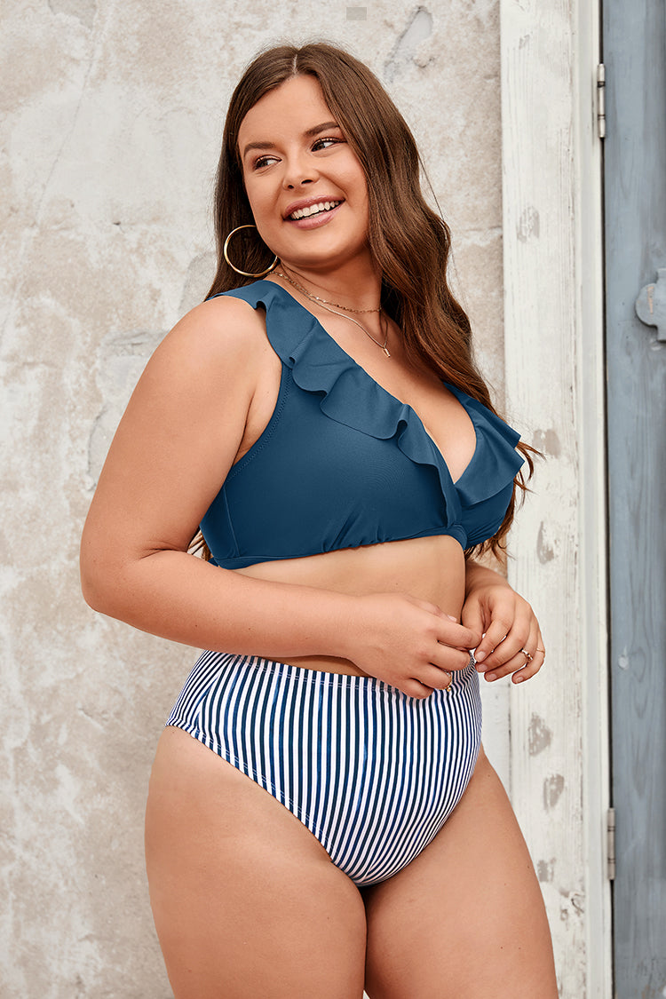 Vous pourriez naviguer sur les mers de l'oc¨¦an tout l'¨¦t¨¦ dans notre bikini grande taille bralette ¨¤ lacer et volants ¨¤ rayures comprenant un haut bralette avec un faux d¨¦collet¨¦ surplis, un dos ¨¤ lacer avec fermeture ¨¤ nouer, des bretelles et une bordure ¨¤ volants, ainsi qu'une paire de bas assortis avec un motif ray¨¦ sur toute la surface, une taille haute, une coupe ¨¦chancr¨¦e et une couverture moderne des fesses.